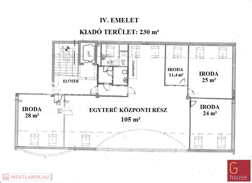 Az első emelet 230nm, mely 4 különálló irodából és egy nagy központi területből áll, a hozzájuk tartozó szociális helyiségekkel.
